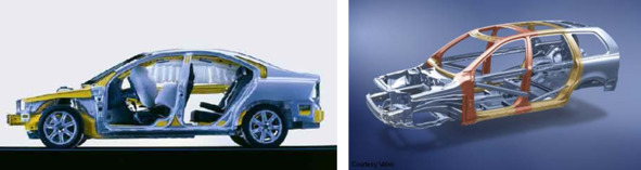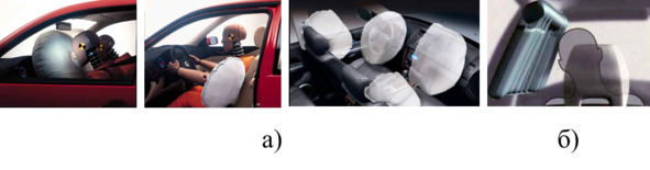 Чтобы обеспечить защиту головы от ударов при столкновениях, создали подушки безопасности (рис. 1.41а), а для случая бокового столкновения компания Volvo разработала дополнительные надуваемые занавески (рис. 1.41б). Это новый тип надувного мешка, который крепится вне поля зрения вдоль боковой стороны крыши. Он обеспечивает равную защиту независимо от того, сидите ли вы спереди или сзади. Если автомобиль ударяется боковой стороной, то занавеска надувается за несколько тысячных долей секунды.