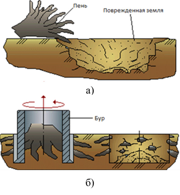 Для аграрных компаний одним из принципов увеличения прибыли является увеличение пахотных земель. Одним из препятствий для земли являются пни старых деревьев, которые нужно убрать, что требует больших бюджетов от аграрных компаний. После корчевания пней остается большая и глубокая яма, так как корни могут уходить на несколько метров вглубь и в стороны, что также связано с дополнительными затратами, так как яму нужно убрать. (рис. 1.49а).
