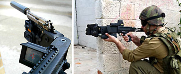 Разработан автомат, передняя часть которого имеет шарнир и может загибаться вправо или влево. На подвижной части установлена камера, и стреляющий видит, что происходит за углом, не высовываясь (рис. 1.52).