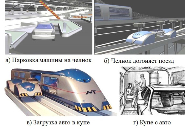 Машина пакуется на челнок (рис. 1.60а). Затем станция по отдельной колее догоняет поезд (рис. 1.60б) и стыкуется с пустым купе. Дверь купе открывается, и машина посредством выдвижной платформы перегружается на поезд (рис. 1.60в).