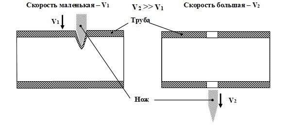 При резке труб нож сминает края, что очень критично для компаний, которые транспортируют нефтепродукты или газ по трубам. Так как неровные края приводят к деформации труб и потенциальным поломкам, что сразу отражается на финансовых показателях транспортной компании. Предложено резку труб осуществлять на большой скорости (рис. 1.62)30.