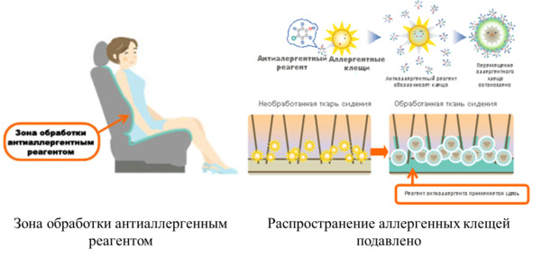 В автомобильных креслах разводятся клещи. Компания Toyota разработала ткань, которая препятствует аллергенам клеща становиться активными в салоне транспортного средства36. Этой тканью будут покрываться автомобильные кресла. Ткань содержит вещество, способное нейтрализовать 98% аллергенов клещей. Это вещество не влияет на цвет или структуру ткани. Принцип работы показан на рис. 1.66.