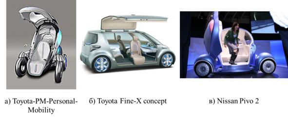 Удобство посадки-высадки значительно усовершенствовано в некоторых автомобилях. В автомобиле Toyota-PM-Personal-Mobility (рис. 1.67а) корпус максимально поднят, а кресло выдвигается вперед. У автомобиля Toyota Fine-X concept (рис. 1.67б) две боковые широкие двери поднимаются наверх, полностью освобождая пространство для входа и выхода. На парковке пол опускается на 20 сантиметров, а кресла разворачиваются на 90 градусов к выходу, немного выступая за пределы автомобиля, облегчая посадку-высадку. В автомобиле Nissan Pivo 2 (рис. 1.67в) разворачивается кабина на 90 градусов.