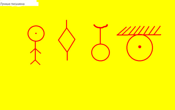 У прародителей человечества письменность выполняла только последнюю функцию, ибо они общались друг с другом телепатически. В те времена у них была сильно развита шишковидная железа, отсюда и развитие всех психических способностей. Для сохранения информации они использовали образное мышление. В этих четырёх знаках передаётся и рассказывается обо всей истории Луны. Так как же перевести это первое письмо? . ЛУНА ЕСМЬ ВРАТА НЕБА