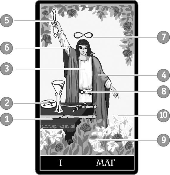 Маг – это Личность, «Я», Божественные побуждения в человеке, воля к поступку. Он олицетворяет активность, творческое начало, амбиции, высокое мастерство и способность воздействовать на других. Его всесокрушающей силе невозможно противостоять. Это не импульсивная воля, рывком пробивающая себе путь к цели, а спокойная уверенность в собственных силах. Маг осознает, что создан по образу Божию и может стать Его подобием. Он смело принимает любой вызов судьбы, самостоятельно управляет ходом событий. Однако осознание собственной силы – большое искушение.