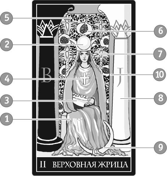 2. Корона – знак высокого положения. Жрица – хранительница сакрального знания. Корона состоит из трех элементов: серп растущей и убывающей Луны, а посередине полная Луна.