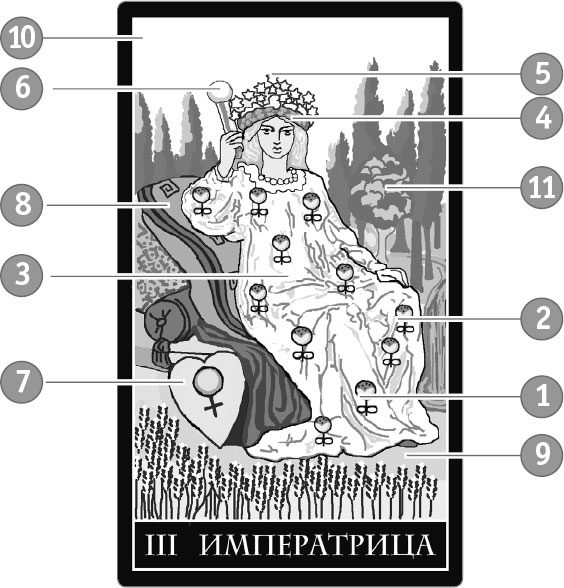 Императрица – дочь Великой Праматери и сама Великая Мать, врата, через которые открывается вход в земную жизнь. В ней нет сумеречных лунных черт Жрицы, она воплощает собой даяние – природу, плодородие, творчество. Это земная мать с ее любовью, чуткостью, которая, однако, может обернуться и злой мачехой с жадным, завистливым нравом, жаждой удовольствий и фальшью.