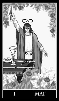 На карте изображен молодой человек, стоящий за квадратным столом. Перед ним находятся предметы: меч, посох, пентакль и чаша. Этот набор не случаен – предметы символизируют четыре стихии, из которых создан физический мир. В поднятой руке человека – магический жезл с луковицеобразным навершием. Другая рука опущена и указывает вниз. Это жест адорации, то есть жест приветствия, почтения. Над головой Мага – изображение лемнискаты – знака бесконечности.