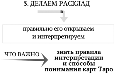 И третий момент. Мы определили тему. Сознательно выложили правильные сигнификаторы. Сформулировали вопросы, сделали расклад. И теперь его необходимо правильно открыть, потому что правильное открытие расклада определяет восприятие информации поэтапно. Есть несколько разных способов, как открывать расклад. Есть способ, когда мы последовательно открываем карту за картой. Соответственно, у нас вырисовывается картина.