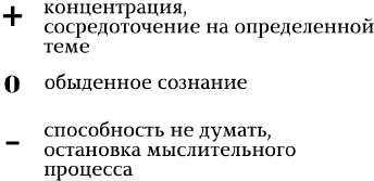 Помимо обыденного состоянии сознания у нас есть такой медитативный спектр и совокупность медитативных практик, позволяющих нам по крайней мере попытаться остановить этот поток мыслей, чувств и желаний. То есть состояние, условно говоря, отвечающее за нашу способность не думать, попытка остановить мыслительный процесс. Конечно, совсем его остановить очень сложно. По крайней мере можно делать усилие, в этом можно тренироваться и даже доходить до какого-то результата. Раз – и перестать думать. Для начала хотя бы перестать внутренне говорить. Это состояние мы условно называем состояние «минус», и оно для нас очень важно. Если кто медитирует и тренируется – хорошо. Если не медитирует, специально не тренируется, то это состояние очень полезно иногда осваивать. Раз – и вы выключились и стараетесь не думать, особенно когда вы работаете с Таро.