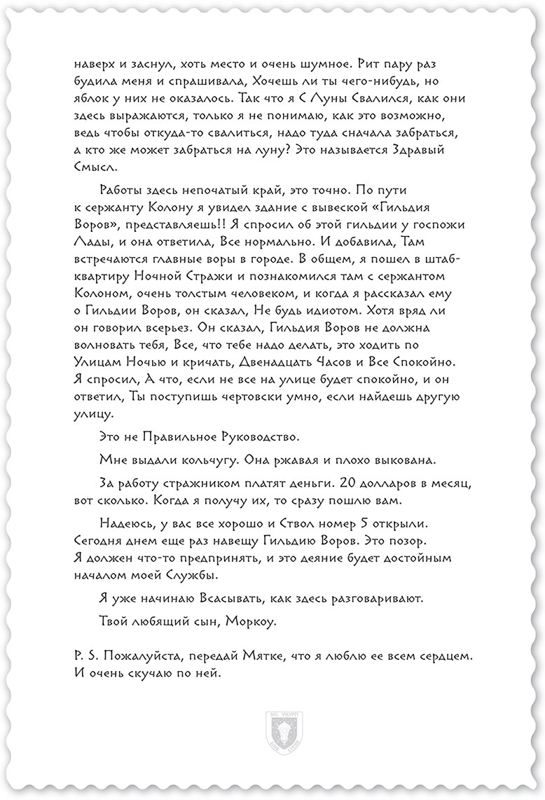 Он приближался к штаб-квартире Ночной Стражи. Это здание было древним и удивительно большим; с одной стороны его подпирала кожевенная мастерская, а с другой – магазинчик портного, изготовлявшего подозрительного вида кожаные изделия. Когда-то давно здание, должно быть, производило впечатление, но сейчас большей частью оно пустовало, и некоторые этажи посещались лишь совами и крысами. Выбитый над входной дверью девиз на древнем языке города почти истерся от времени, въевшейся грязи и плесени, однако еще можно было разобрать следующие буквы: