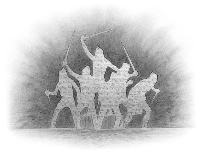 Контуры, отпечатавшиеся на кладке, выразительно изображали шестерых человек, застывших в удивленных позах. Разнообразно воздетые руки сжимали то, что раньше было ножами и абордажными саблями.