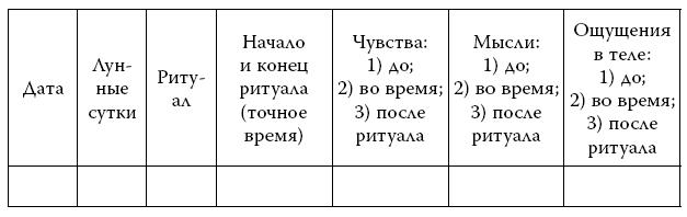 Лунный дневникВсе эти тридцать дней, пока ты будешь учиться лунной магии, я советую тебе вести дневник. Это очень мощный магический инструмент, который станет твоим помощником и талисманом на всю жизнь. В этом дневнике нужно записывать, какие ритуалы ты совершила, свои чувства и мысли до, после и во время магической практики. Есть два способа ведения дневника: свободный и в виде таблицы.