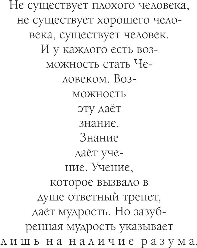 Человек должен отдавать себе отчёт в своём поступке. Всё, что я делаю другому, я получаю обратно вдвойне: делаю хорошее – получаю обратно вдвойне, делаю плохое – получаю обратно вдвойне. То, что человек, сделав плохое, падая, ломает кость, означает маленькое наказание за маленькое преступление. Ему ещё повезло, что наказание последовало сразу. За большой грех расплата приходит позже, порой даже в будущей жизни. Кто жалуется на свою трудную судьбу, пусть подумает, что это есть искупление за грехи предыдущей жизни. Если человек по недомыслию совершает плохой поступок, придёт наказание, а если делает это осознанно и преднамеренно, то последует большая кара. Особенно распространены в нынешнее время ругань, проклятия, злорадство, преступления. Наказание ждёт своего часа.