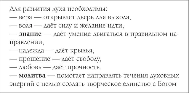 Дух – творящая разумная движущая сила. Желая добра, мы быстро продвигаемся вперед. Будучи неудовлетворенными или недоброжелательными, мы стоим или кружимся на месте, чтобы найти правильную дорогу. В жизни нет обратного движения. Дух – это идея, он словно семя, которое мы бросаем в землю. Если с любовью посадить семя, вырастет сильное растение. Душа погоняет сзади, заставляет идти вперёд, не дает покоя, если она позитивная.