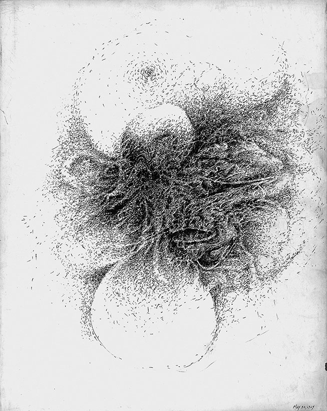 Они хранились в кладовке. Роберт разложил их передо мной на полу. Рисунки, гравюры… Он разворачивал скатанные холсты. Мне вспомнились Ричард Пуззет-Дарт[23] и Анри Мишо. Сквозь переплетенные слова и каллиграфически выписанные строки сочились разнородные энергии. Наслоения слов сгущались в энергетические поля. Картины и рисунки словно бы всплывали из глубин подсознания.