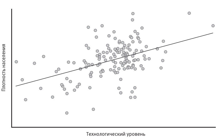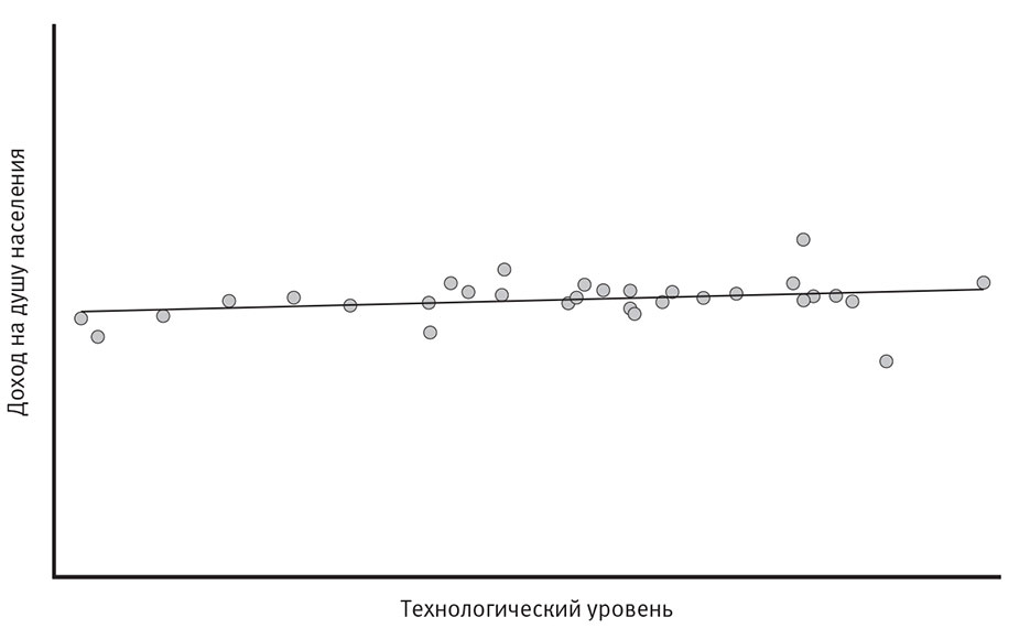 Графики, составленные для разных стран на 1500 г., показывают, что технологический уровень (определенный с учетом времени, прошедшего с момента неолитической революции) оказывал положительное влияние на плотность населения (вверху) и не оказывал влияния на доход на душу населения (внизу). Кружками обозначены отдельные регионы, принятые в их современных международных границах[40].