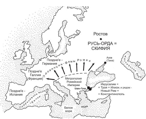 Среди таких фем-провинций были: африканский Египет, Русь-Орда, территории Западной Европы, где впоследствии (в XVI–XVII веках) возникнут – Германия, Италия, Франция, Англия, Испания и т. д. Подчинение фем имперскому центру довольно гибкое. Одним из признаков вассального положения было выплачивание дани Иерусалиму = Царь-Граду (Еросу). Кроме того, начиная с конца XII века, фемы объединялись общей христианской религией. Царь-Град – общепризнанный религиозный центр всего Царства. Может быть, слово Фема или Тэма связано с ордынско-татарским словом Тумен, то есть с русским словом ТЬМА, что означало воинскую единицу (тьма = много).