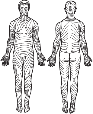 • соединительно-тканный – при этом виде массажа воздействуют в основном на соединительную ткань, подкожную клетчатку. Основные приемы соединительно-тканного массажа проводят с учетом направлений линий Беннингофа (рис. 2);