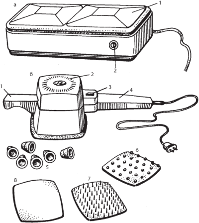 Рис. 2. Массажные аппараты: а – общий вид ПЭМ-1: 1 – вибрирующая площадка; 2 – регулятор частоты вибрации; б – вибромассажер электрический ЭЛЬВО: 1 – дополнительная рукоятка; 2 – корпус; 3 – выключатель; 4 – основная рукоятка; 5 – колокола-присоски; 6 – сферические выступы; 7 – шиповая насадка; 8 – плоская насадка