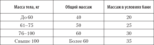 Примерная продолжительность (мин.) общего тренировочного массажа в зависимости от массы тела спортсмена