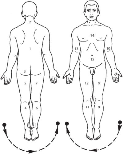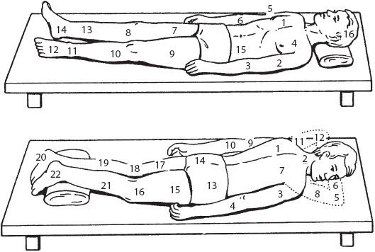 При общем тренировочном массаже спортсмена массируют в определенной последовательности (рис. 3). Продолжительность ручного массажа отдельных областей и частей тела примерно следующая: спины, шеи, надплечья, ягодичной (поясничной) области – 8 мин.; бедра, коленных суставов, голени, голеностопных суставов, стопы – 16 мин.; плеча, локтевых суставов, предплечья, лучезапястных суставов, кисти, пальцев – 14 мин.; груди, живота – 7 мин.