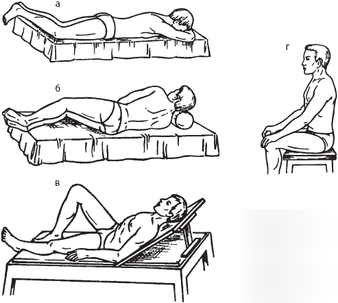 Рис. 6. Позы массируемого при проведении массажа: а – лежа на животе; б – лежа на боку; в – лежа на спине; г – сидя