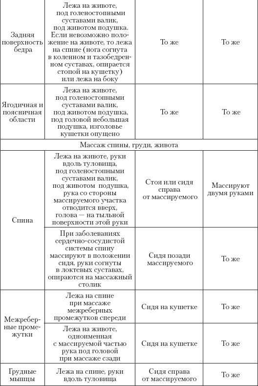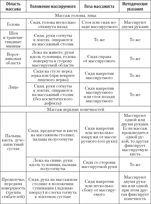Основные рекомендации по проведению массажа в различных областях тела представлены в табл. 2.