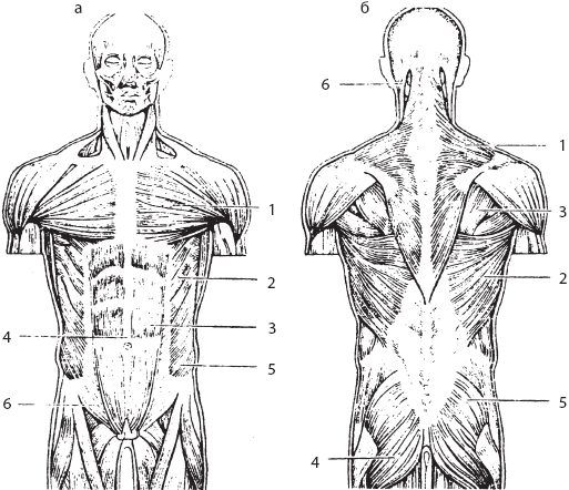 Рис. 9–1. Мышцы человека: а – вид спереди: 1 – большая грудная мышца; 2 – передняя зубчатая мышца; 3– прямая мышца живота; 4 – белая линия живота; 5 – наружная косая мышца живота; 6 – паховая связка; б – вид сзади: 1 – трапециевидная мышца; 2 – широчайшая мышца спины; 3 – большая ромбовидная мышца; 4 – средняя ягодичная мышца; 5 – большая ягодичная мышца; 6 – грудино-ключично-сосцевидная мышца