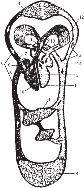Рис. 11. Органы кровообращения (схема): 1 – сердце; 2 – артерии; 3 – вены; 4 – капилляры; 5 – левый желудочек; 6 – правое предсердие; 7 – верхняя полая вена; 8 – нижняя полая вена; 9 – аорта; 10 – правый желудочек; 11 —легочный ствол; 12– капилляры легких; 13 – легочные вены; 14 – левое предсердие
