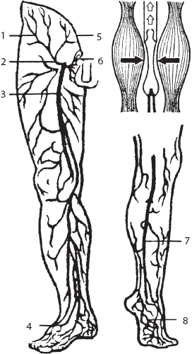 Рис. 12. Кожные вены нижней конечности (вид спереди и сзади) и схема «мышечного насоса»: 1 – поверхностная вена, окружающая подвздошную кость; 2 – место впадения большой подкожной вены; 3 – большая подкожная вена нижней конечности; 4 – венозное сплетение тыла стопы; 5 – поверхностная надчревная вена; 6 – наружные половые вены; 7 – малая, или задняя, подкожная вена голени; 8 – венозная подошвенная сеть
