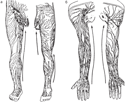 Рис. 13. Поверхностные лимфатические сосуды нижней конечности (а) и верхней (б)