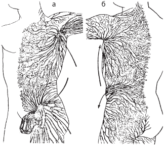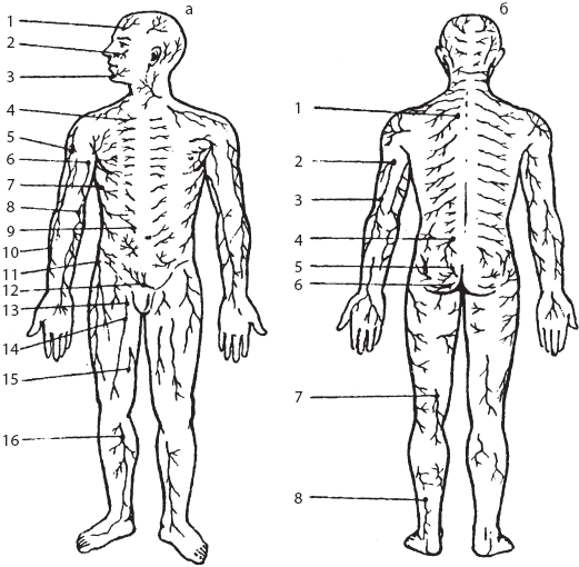 Рис. 15. Поверхностные лимфатические сосуды: а – передней поверхности тела; б – задней поверхности тела