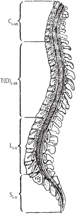 Рис. 16. Сегментарное деление спинного мозга: СI – VII – шейный отдел; T(D)I – XII – грудной отдел; LI – V – поясничный от дел; SI – V – крестцово-копчиковый отдел