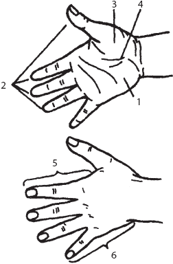 Рис. 18. Ладонная и тыльная поверхности: 1 – возвышение 5 пальца; 2 – концевые фаланги пальцев; 3 – возвышение 1 пальца; 4 – основание ладони; 5 – лучевой край кисти; 6 – локтевой край кисти