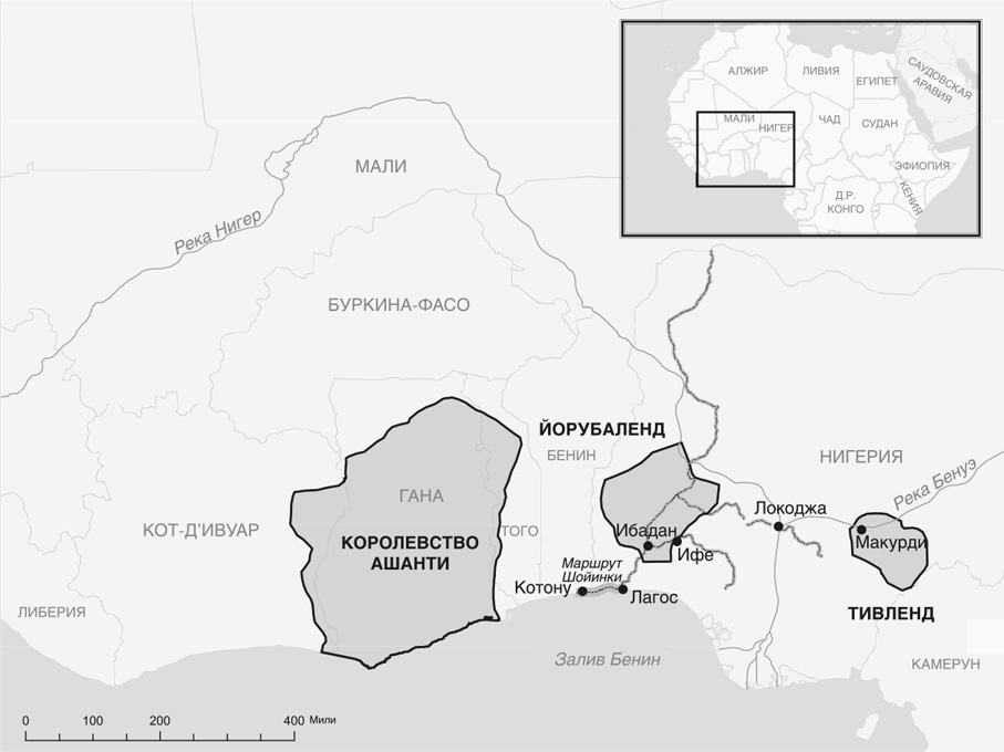 Карта 1. Западная Африка: исторические империи Ашанти, Йорубаленд и Тивленд, а также маршрут Воле Шойинка из Котону в Лагос