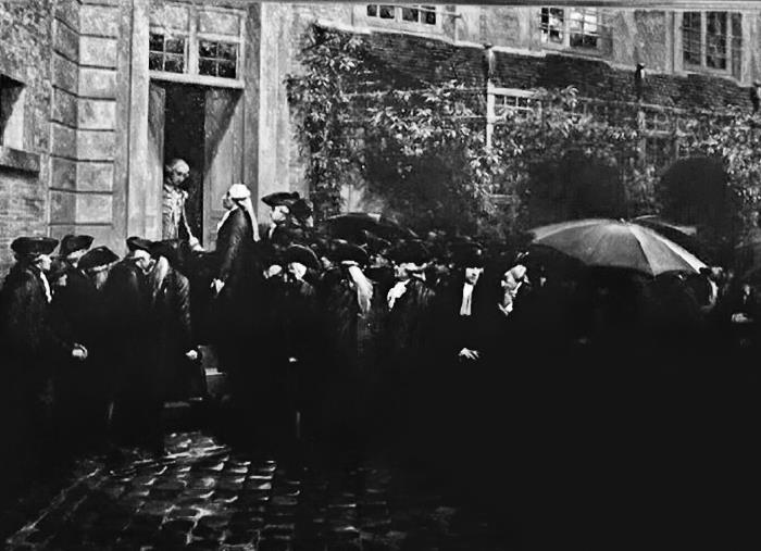 Депутаты-аристократы были великолепны – щеголяли в заломленных шляпах с роскошными перьями, в бархатных плащах. С этой средневековой роскошью удачно сочетались лиловые сутаны епископов, красные мантии кардиналов. За ними двигалась черная масса – третье сословие.