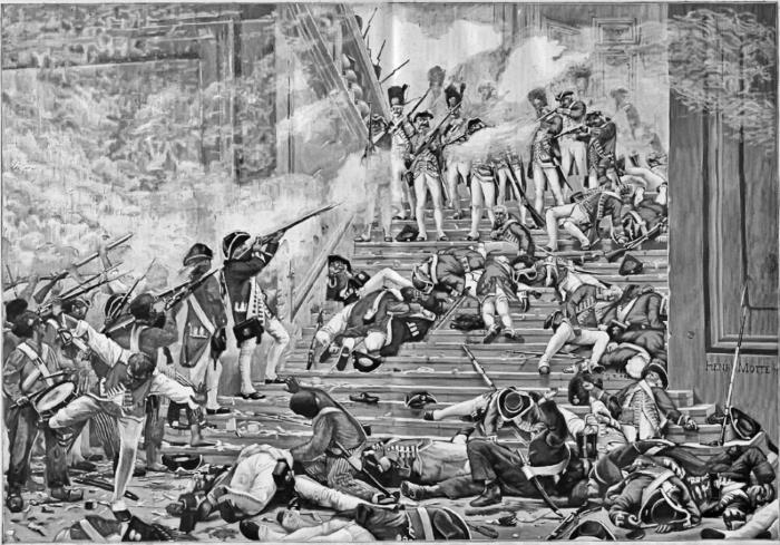 В это время бой шел уже в самом дворце. Король запретил стрелять в толпу из орудий. Толпа теснила швейцарцев, а они, тысяча человек, очень метко и очень успешно отстреливалсь из ружей. Наступил момент, когда казалось, что они отобьют атаку. Швейцарцы уже оттеснили толпу из дворца на площадь Каррузель и захватили пушки, брошенные нападавшими…