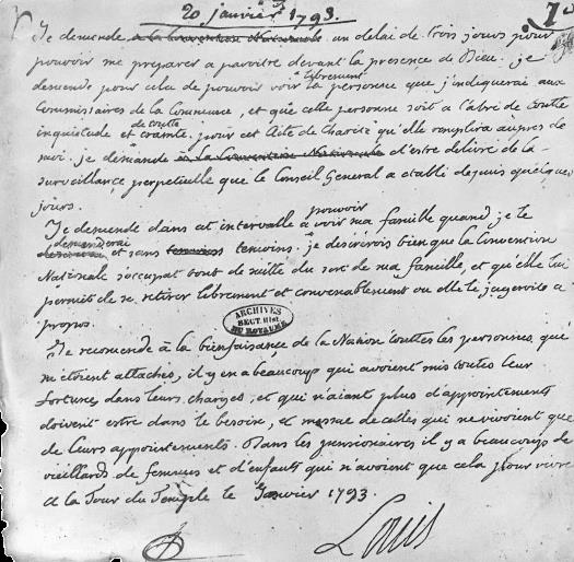 Письмо Людовика XVI, написанное накануне казни. Национальный архив Франции.