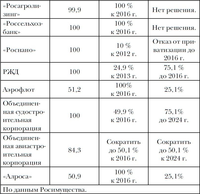 Правда, от политики полного сдерживания деятельности госкомпаний в инвестиционной сфере правительство отошло, но это происходило в его противоборстве с государственными компаниями. Характерно в этом плане стремление отбирать всю прибыль у «Роснефти». В декабре 2012 года вице-премьер Аркадий Дворкович предложил забрать у компании дополнительно 150,7 млрд рублей, полученных от продажи части ее акций BP. В конце 2013 года правительство рассматривало вариант изъятия до 95 % прибыли у государственной компании «Роснефтегаз», владеющей около 70 % акций «Роснефти» и около 11 % акций «Газпрома»[32].