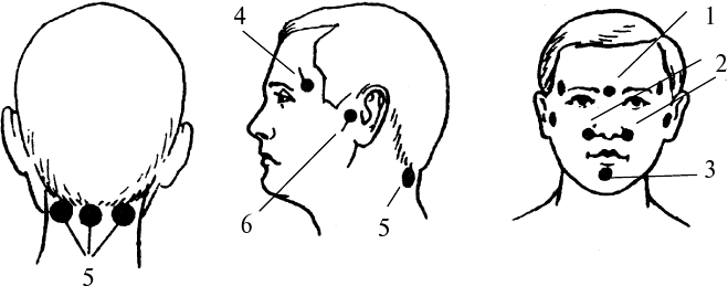 5 – точка на границе шеи и головы, чуть выше линии роста волос в ямке;
