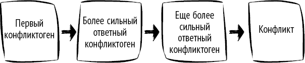Таким образом, первый конфликтоген, дающий начало случайному конфликту, возникает в результате негативного рефрейминга одного из участников. Если он отвечает конфликтогеном, то, в силу закона эскалации конфликтогенов, этот ответный конфликтоген, как правило, более сильный, чем тот, реакцией на который он является. Теперь уже первая сторона чувствует себя ущемленной и так же отвечает более сильным конфликтогеном. Затем вторая сторона отвечает еще более сильным конфликтогеном и т. д. Этот обмен «ударами» и приводит к конфликту.
