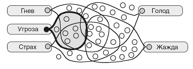 Другой вопрос может коснуться того, что происходит, когда несколько наборов включено вместе – и в итоге некоторые ресурсы оказываются одновременно в возбужденном и подавленном состоянии? Это может привести к психическим состояниям, которые мы характеризуем как «смешанные чувства». Например, когда человек сталкивается с чем-то, определяемым им как Угроза, у него могут включиться одновременно Гнев и Страх.