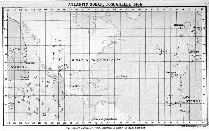 Предположительно проект Колумба опирался на переписку с крупным итальянским ученым Паоло Тосканелли, который выполнил расчеты примерных размеров Земли. То, что Земля – шар, в XV веке было уже очевидно, хотя в прошлом столетии за эту мысль еще сжигали на кострах. Идея Колумба состоит в том, что, если плыть все время на запад, окажешься в конце концов на востоке – в Китае или Японии.