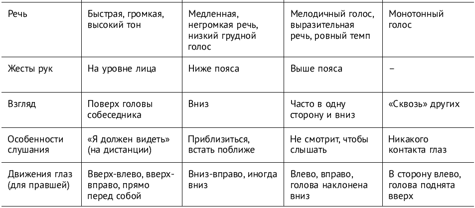 Мы показали, что явно выраженные визуалы, кинестетики, аудиалы и дигиталы имеют свои специфические особенности в поведении, телодвижениях, в речи, дыхании и др. Для удобства читателя кратко представим наиболее характерные их признаки в таблице, приведенной на следующей странице.