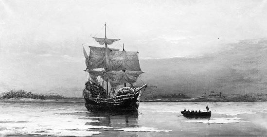 Корабль «Мейфлауэр», который в 1620 году привез на побережье Массачусетса 102 пуритан-кальвинистов («отцов-пилигримов»), что считается началом целеустремленной колонизации англичанами нового континента. Худ. Уильям Халсал (1882)