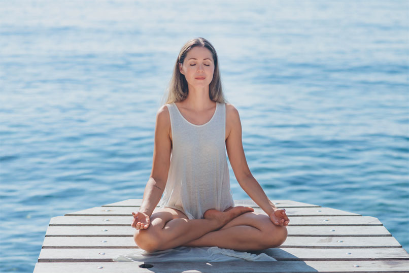 Многие предпочитают сидеть на стуле с прямой спинкой или на подушке. Я чаще всего медитирую сидя на полу в Позе неполного лотоса – Ардха Падмасана с Джняна-мудрой в ладонях: если дома, то пользуюсь специальной подушкой для медитации, если нет – покрывалом, пледом или йога-матом, сложенными наподобие такой подушки. Вы также можете использовать Джняна-мудру или то положение рук, которое описано в практикуемой технике.