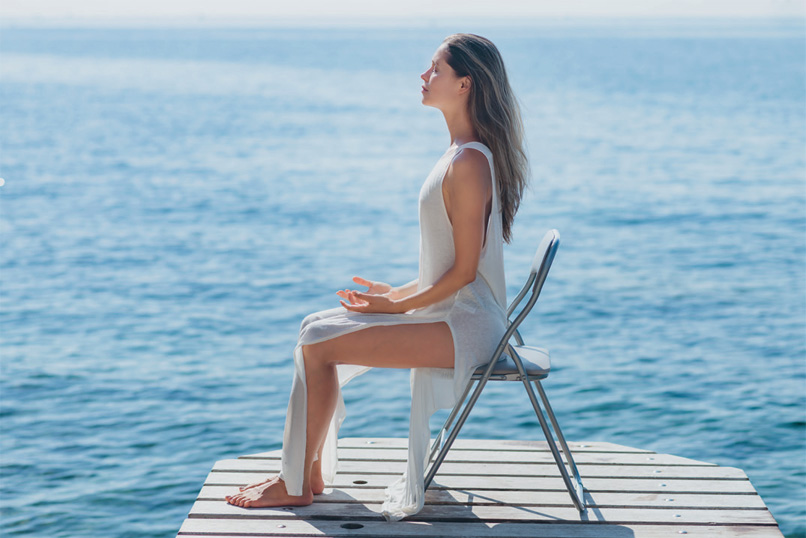 Идеально подходит для новичков или кратковременной медитации в офисе. Лучше всего использовать стул без спинки с твёрдой поверхностью.