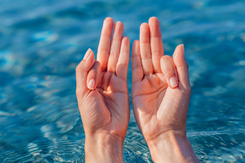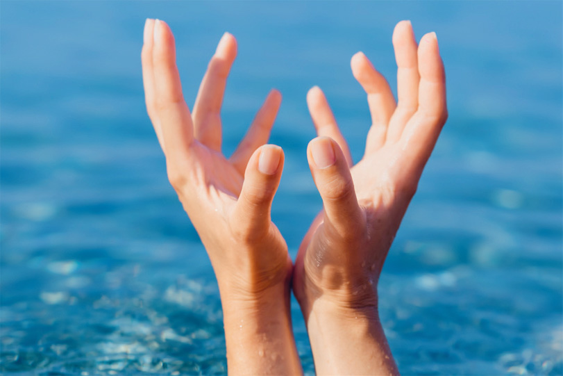 Опустите и расслабьте плечи. Раскройте грудную клетку чтобы дыхание было свободным. Сложите руки под животом чуть ниже пупка так, чтобы тыльная часть одной кисти лежала в ладони другой. В интернете можно встретить информацию, что правая ладонь обязательно должна[4] лежать поверх левой. В действительности для этого нет достаточных оснований.