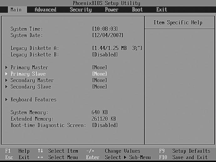 Меню MainВ разделе Main вы можете установить дату и время, определить установленные дисковые накопители, установить параметры клавиатуры и просмотреть информацию об установленной оперативной памяти.